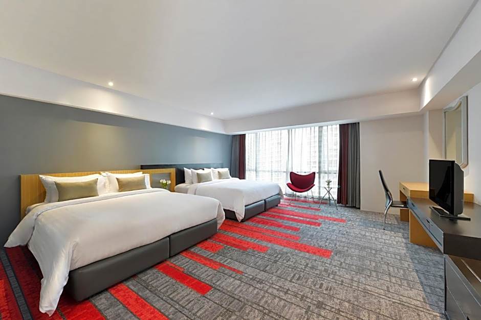 Featuring city views, this large room features an ergonomic work space, a flat-screen TV and a DVD player.